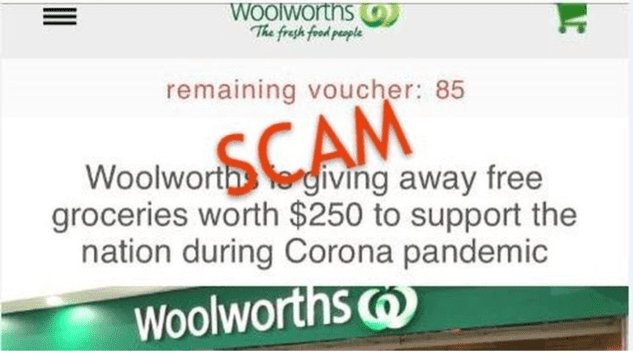 “Scams include the recent fake Woolworths vouchers, fake cures, requests for donations, medical scams and fake stimulus packages”.